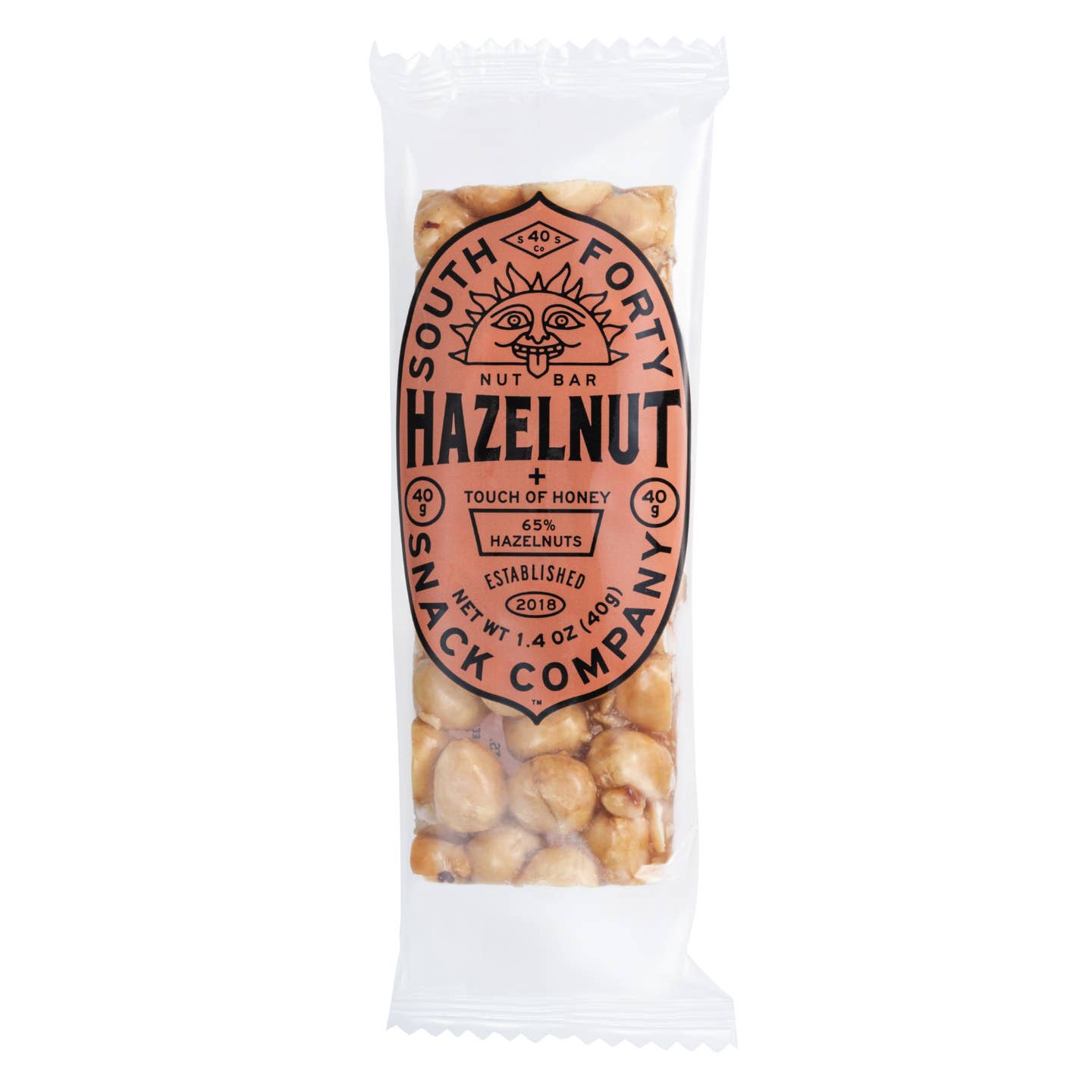 South Forty hazelnuts are sourced from 100-year-old orchards along the Black Sea’s southern coast of Turkey. Most of the nuts are harvested by hand by bending branches and removing clusters while still on trees. Our crunchy hazelnut bars have just four ingredients and are 65% hazelnuts. The perfect balance of nutty and sweet.