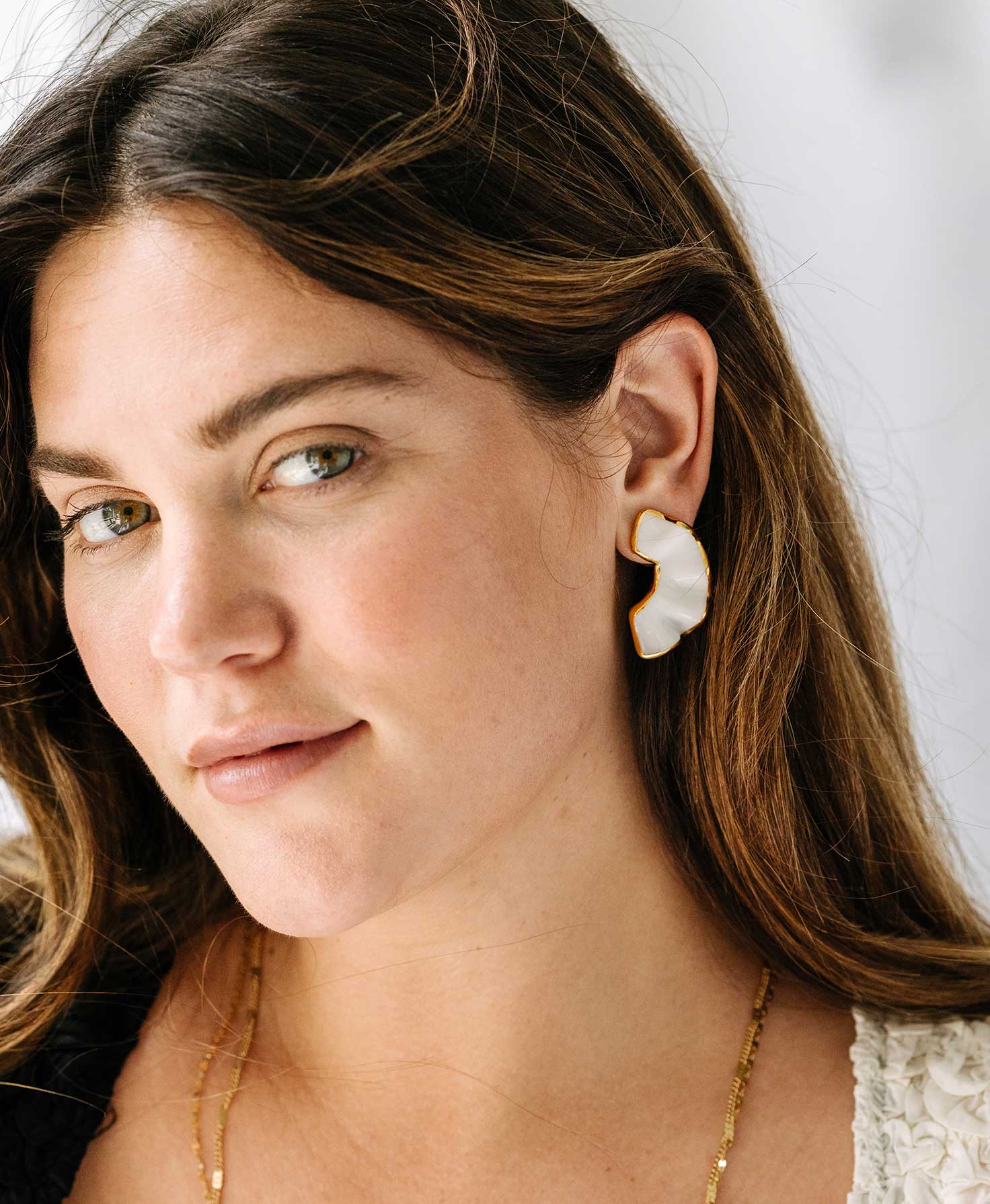 This fan-shaped pair is crafted of shining white porcelain accented with a gleaming gold border. While they would look right at home in an art exhibit, we think this pair would look even better on you! The surgical steel posts make them the perfect earrings for even sensitive ears.