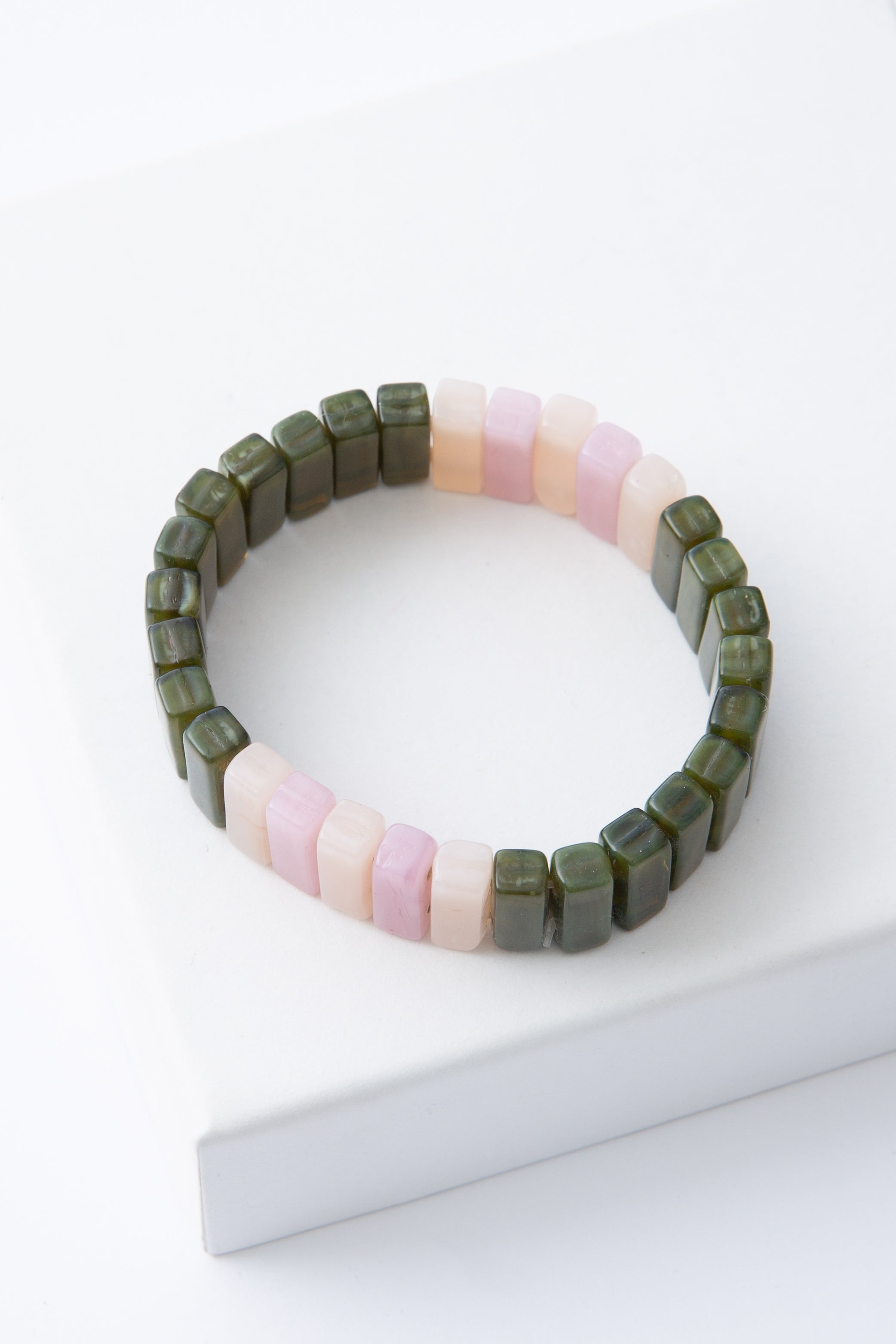 Smooth glass beads in deep olive and pastel shades are strung to create a cool color-blocked bracelet. Its stretchy fit makes it perfect for a variety of wrist sizes.