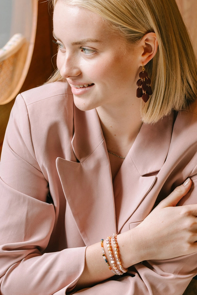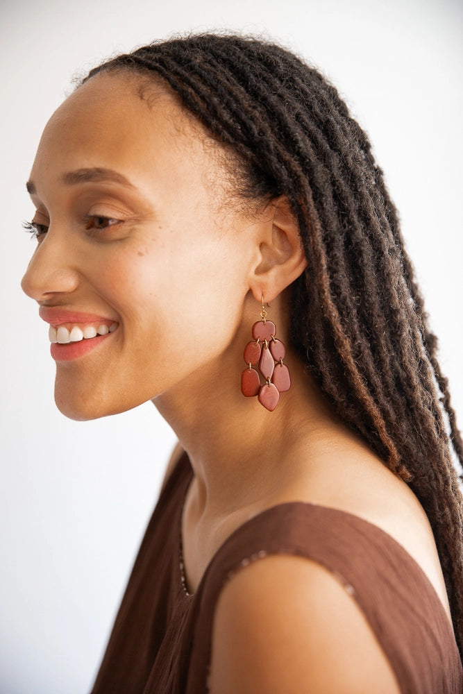 Our Tagua Cascada Earrings are the perfect geometric chandelier earring. They feature carved tagua pieces in a deep rust shade that have all the beauty of stone, but with a fraction of the weight. The gold surgical steel posts make this stunning pair ideal for sensitive ears.