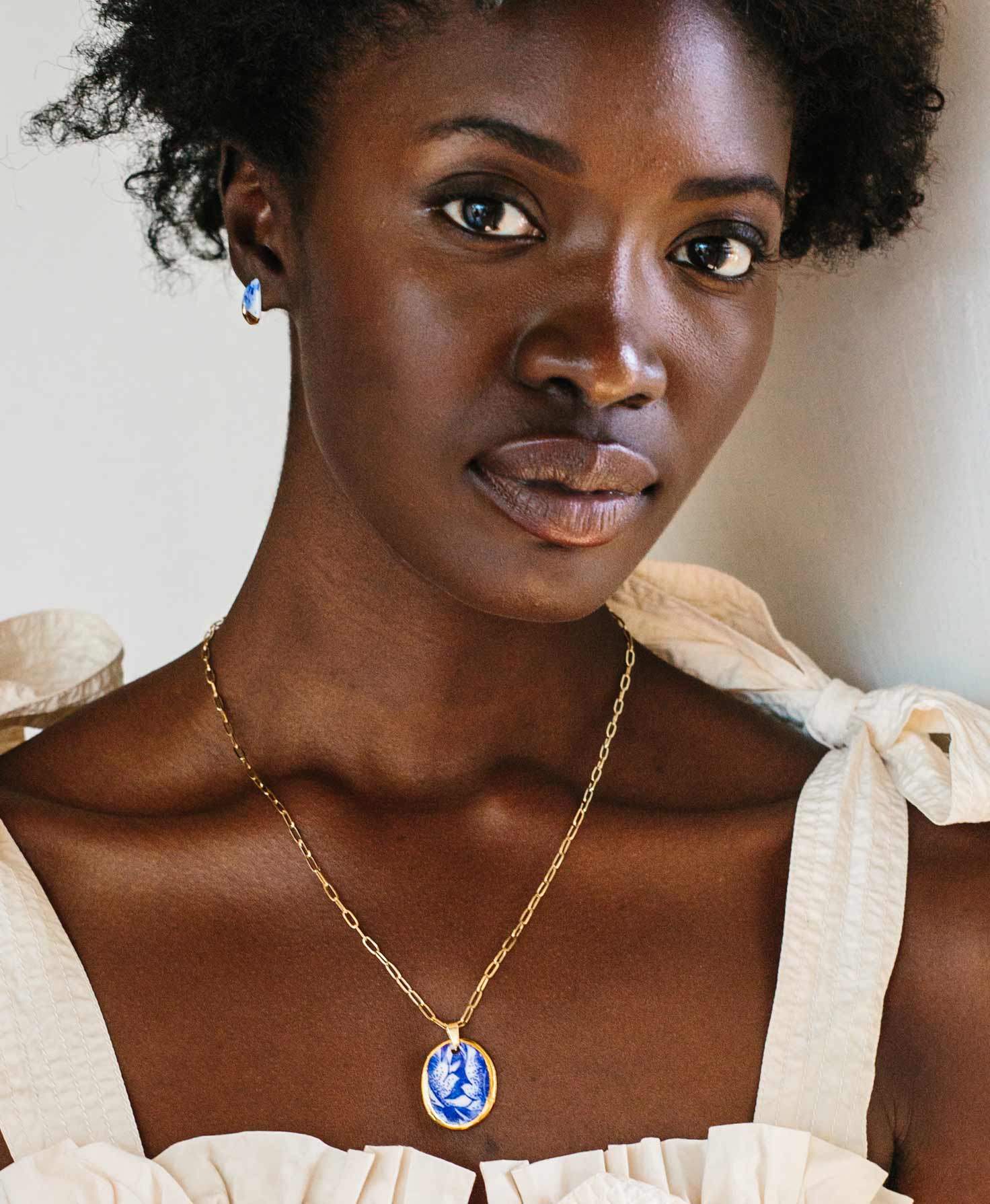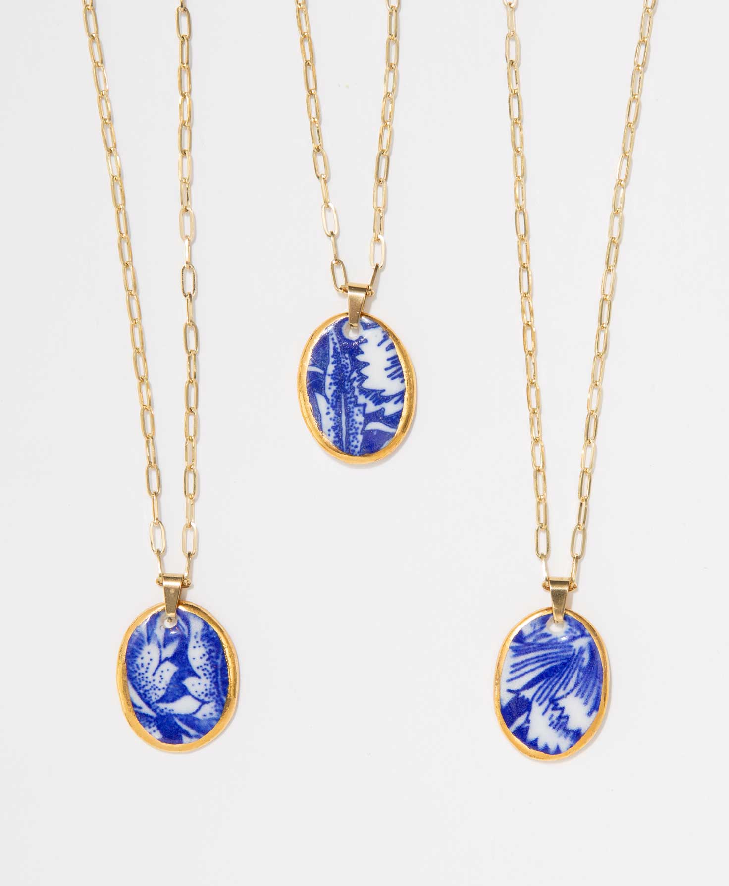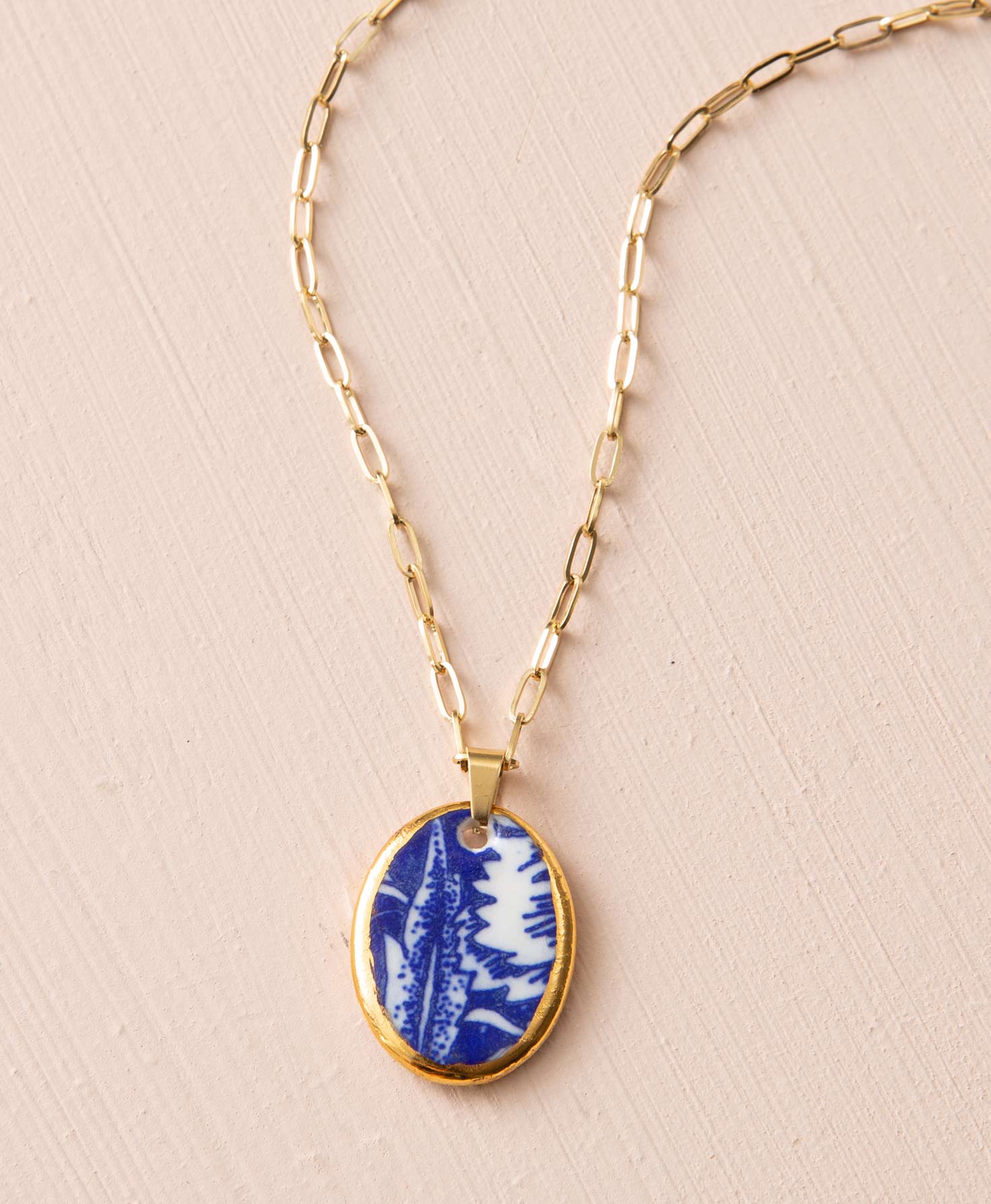 Artisans use a traditional technique using rice paper to transfer this elegant design onto a porcelain pendant. Hand painted gold luster and 14K gold-plated stainless steel chain tie the piece together.