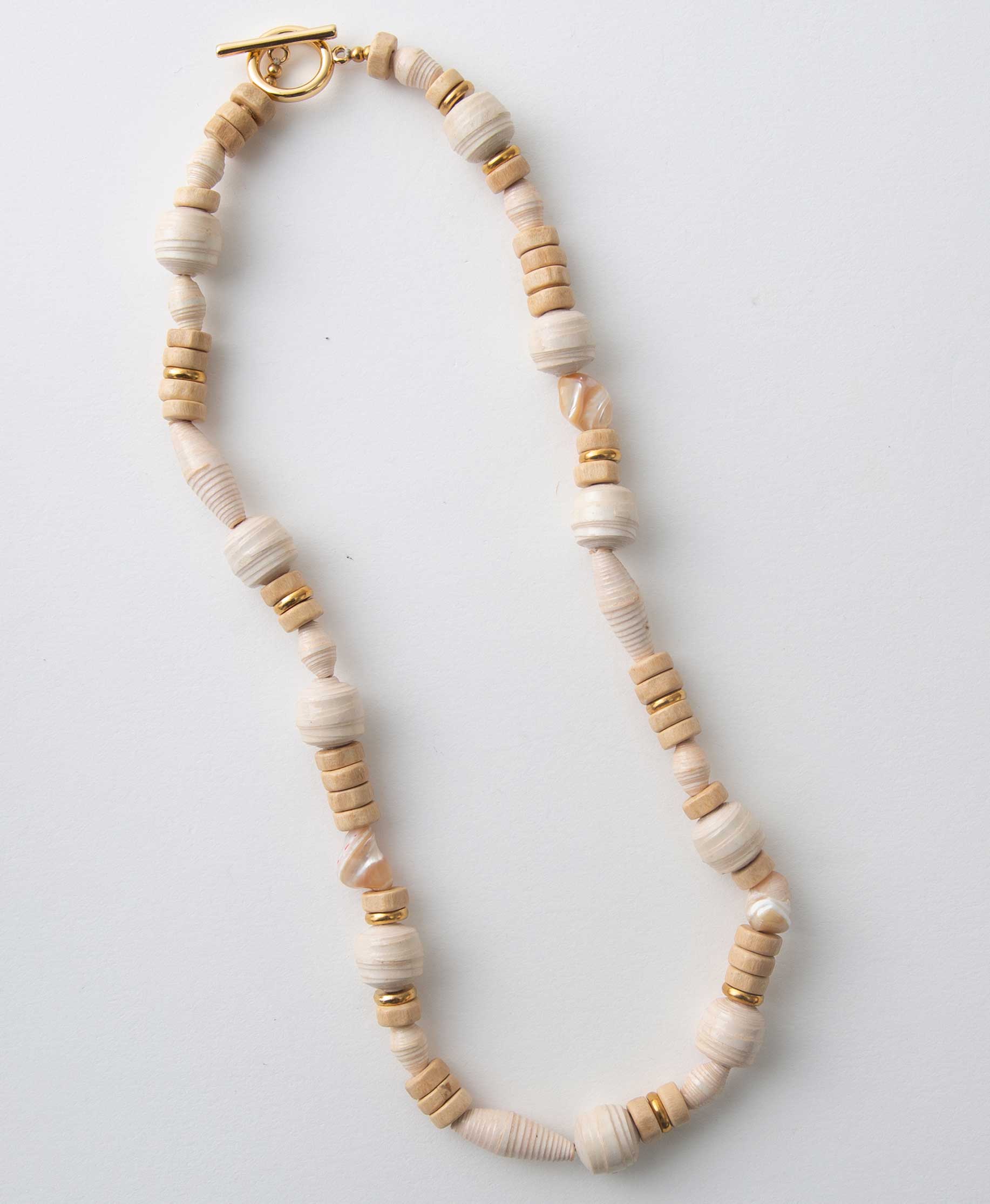 "Elevated natural" is one of our favorite looks of the moment, and the Victoria Necklace captures the vibe perfectly. Natural wooden beads are strung alongside chunky paper beads, elegant pearl beads, and shimmering brass for a necklace that looks lovely with any outfit-naturally.